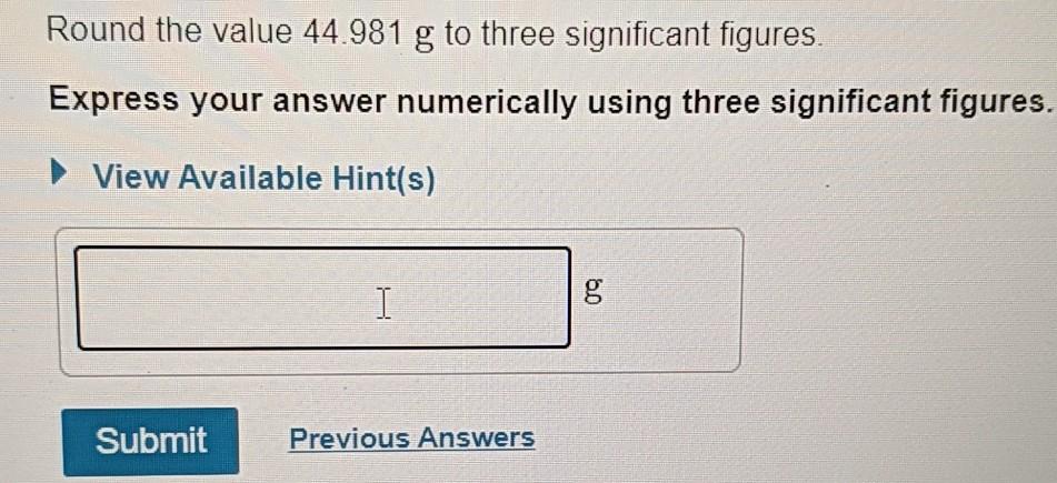 Solved Round The Value 44 981 G To Three Significant Figures Express Your Answer Numerically Using Three Significant Figures View Available Hint S G Submit Previous Answers